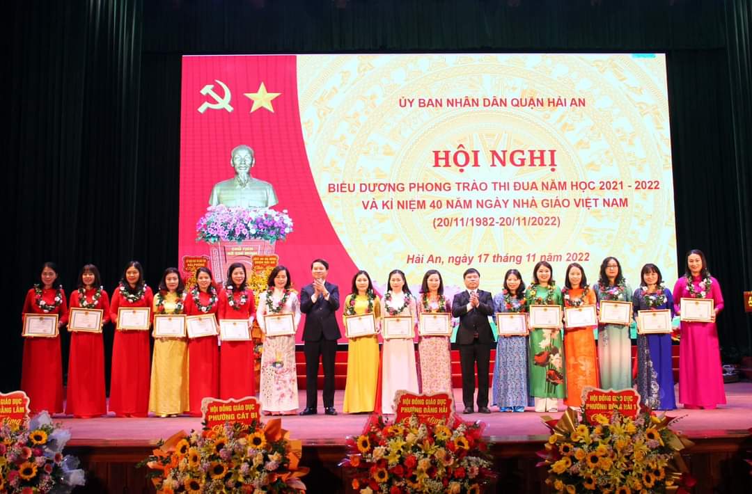 Nhân dịp kỷ niệm 40 năm ngày nhà giáo Việt Nam 20/11, sáng 17/11 quận Hải An tổ chức hội nghị biểu dương phong trào thi đua năm học 2021 – 2022, tôn vinh thầy cô giáo tiêu biểu xuất sắc và học sinh đạt thành tích cao trong học tập. Tới dự có các đồng chí Đỗ Văn Lợi- PGĐ Sở giáo dục và đào tạo thành phố, Nguyễn Văn Tuấn- TUV- BTQU- CT HĐND quận, Dương Đình Ổn- PBT- CT UBND quận, Nguyễn Anh Tuấn- PBTTTQU, các đồng chí PCT HĐND, UBND, các đồng chí UVBTVQU, trưởng các ban, ngành, đoàn thể, các phòng ban chuyên môn của quận, lãnh đạo Đảng ủy, HĐND, UBND các phường trên địa bàn quận cùng đông đảo các thầy cô giáo, các em học sinh đạt thành tích cao trong học tập tham dự lễ biểu dương.